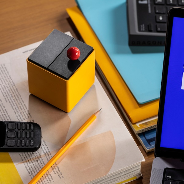 To escape the traditional box shape, I designed a first prototype with a, how to say... indefinable look. I think I had just figured out how to make revolution objects with Fusion. I painted it yellow, and the arm pink, because there was enough gray outside. You can see it all in action in this video.