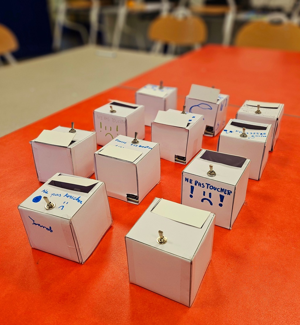 Every year, I run a workshop at the Arbalète school in Paris (with my son Armand), during which children build a small electronic object that they can take home. Last year, it was a small robot made from plastic cups that lit up and turned its head when touched. This year and the year after, they made a useless box.