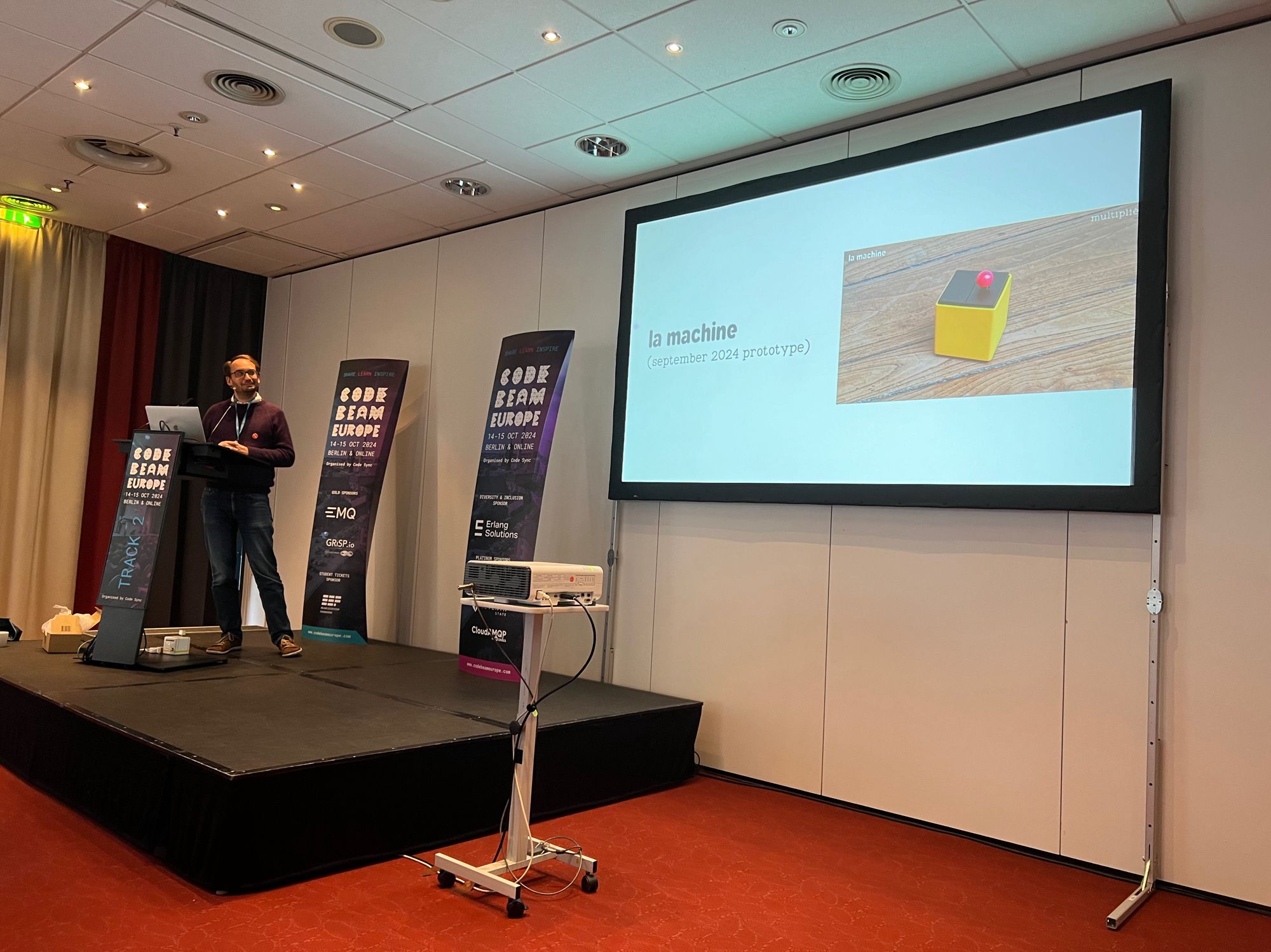During one of my frequent lunches with my friend Paul Guyot, we talked about the machine. For those who don't know him, he was the technical director of Violet, the company behind the Nabaztag. He's done lots of things since, but he was the one who in 2019 wrote the iconic Nabaztag services in Python for the TagTagTag kit. I showed him the prototype and he offered to help me with the software which, although seemingly simple, needed to be approached professionally. He also urged me to use Erlang but he advises me to do that for every new project. Erlang is a functional language, close to LISP. LISP was used by AI pioneers, including Marvin Minsky, the inventor of the useless box. Are you following? Anyway, we went with Erlang and now I just have to learn it (and so do you). Paul also proposed to give a conference about the machine at the Erlang festival in Berlin in October. His talk is here.
