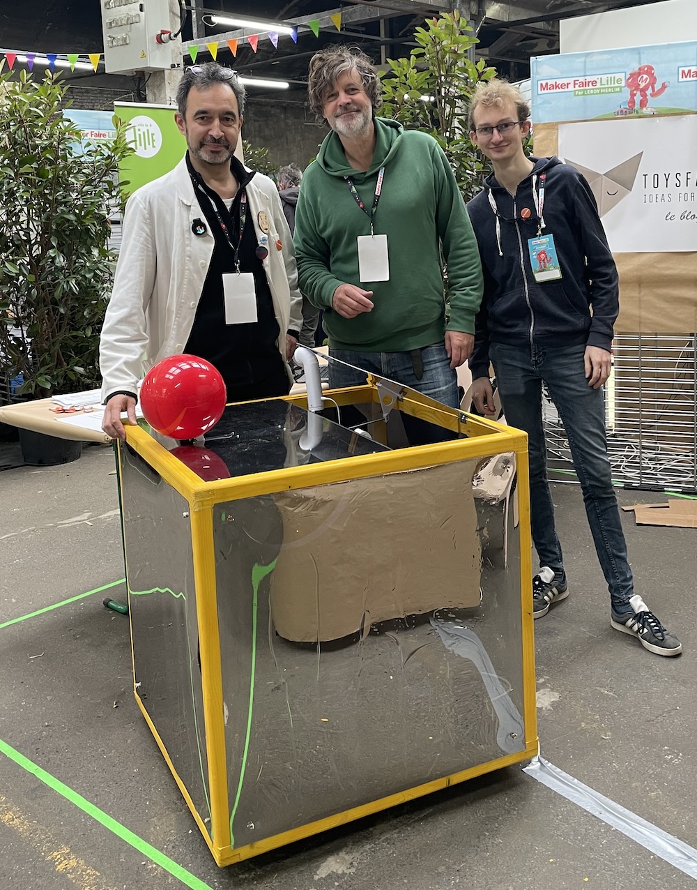 The brick machine was born from meeting Loïc Brun, LEGO Master finalist, during the exhibition of his creations at the Musée-Galerie Carnot in Villeneuve-sur-Yonne! It consists of 377 LEGO™ pieces, a specially designed electronic board, a servo motor, a speaker and, of course, a button. It can be assembled in two hours and there may still be some in stock here.