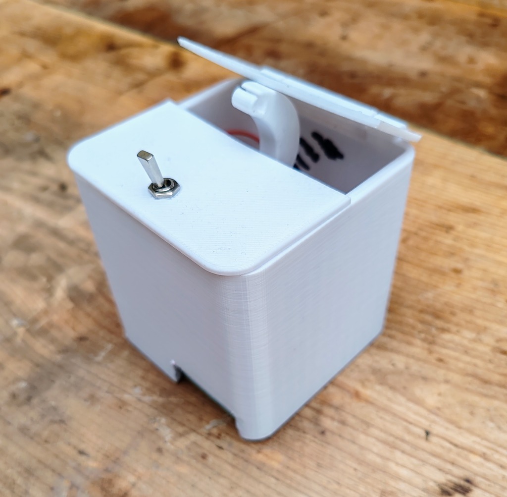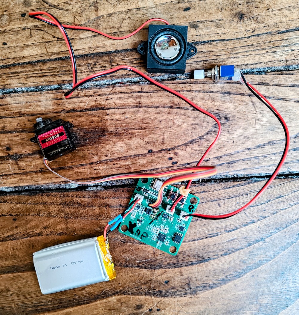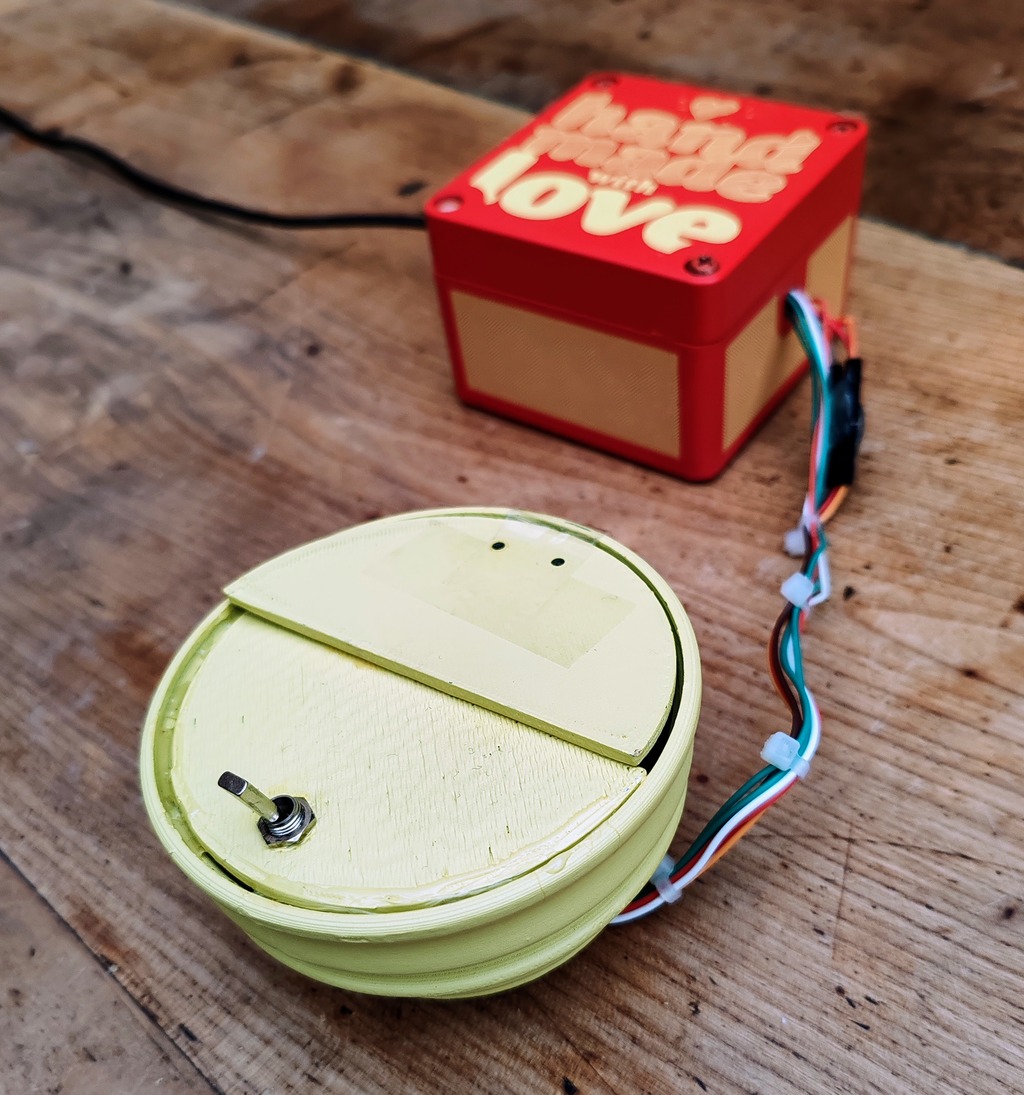 Next, I had to make a real box, with a real lid guaranteed without tape, that would integrate the electronics, motor, switch and arm. I opted for brass hinges and tested skeuomorphic-inspired sounds – a path abandoned later, but at that moment, I was so happy! You can see it all in action in this video.