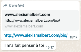 While I had a precise idea of the type of design and kind of behaviors for the machine, I was until recently very uninspired regarding the sounds. I was picking a bit randomly and without conviction from different sound banks. I was even so desperate that at one point I thought I would generate sounds with AI algorithms. I was at rock bottom. And one day my daughter Violette sent me a message (see opposite) telling me about Alexis Malbert. It was a revelation. First, I was very flattered but above all I was certain I had finally found the right madman.